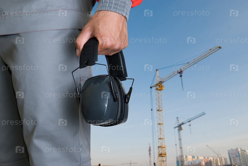 Защитные наушники в руках мужчины на фоне стройки