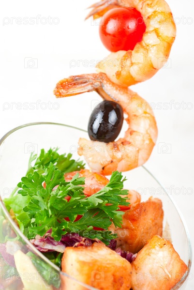 Жареный шашлык из креветок с овощами, зеленью и рыбой