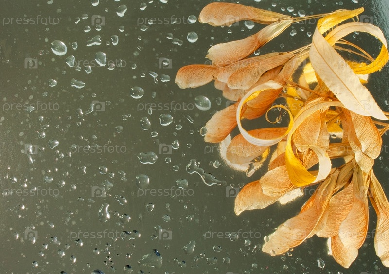 Сухие листья на фоне с каплями воды, шаблон