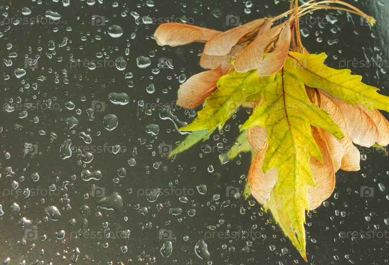 Сухие листья на фоне с каплями воды, шаблон