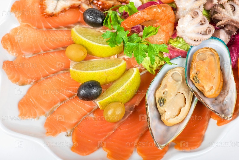 Закуска из морепродуктов с лимонами и маслинами