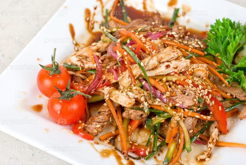 Мясной салат с овощами в тарелке