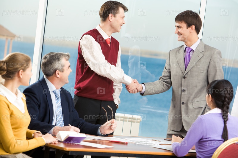 Успешные партнеры пожимают друг другу руки, пока их коллеги смотрят на них