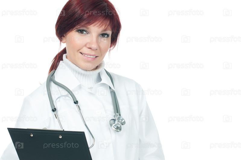 Молодая женщина-врач с планшетом для записей, на белом фоне