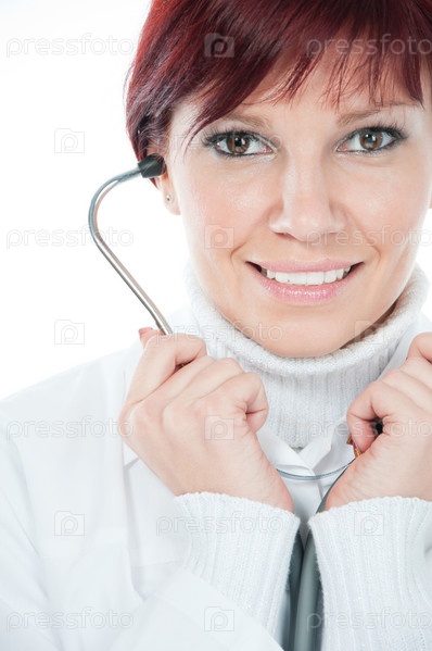 Крупным планом портрет улыбающейся женщины-врача с фонендоскопом на белом фоне