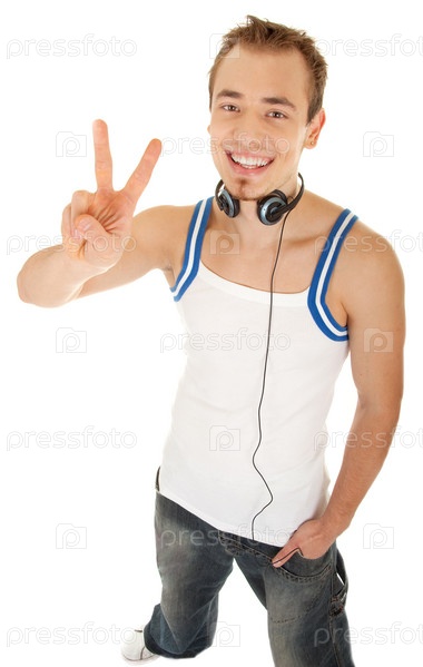 Портрет улыбающегося молодого человека с наушниками, показывающего знак "победа"