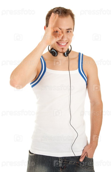 Портрет улыбающегося молодого человека с наушниками, показывающего знак "ок"