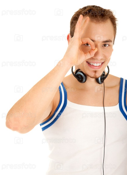 Портрет улыбающегося молодого человека с наушниками, показывающего знак "ок"