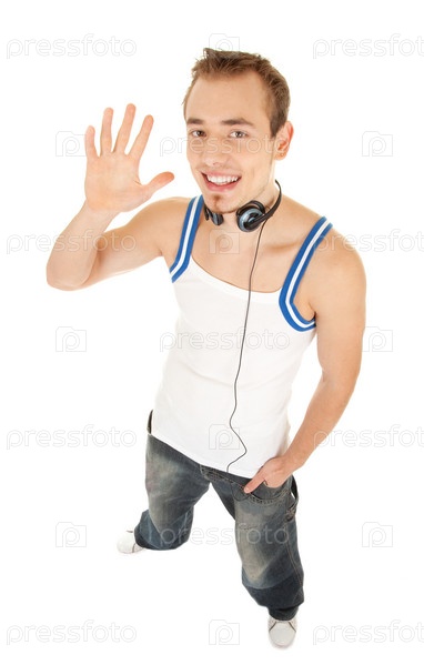 Портрет улыбающегося молодого человека с наушниками, показывающего приветственный знак рукой