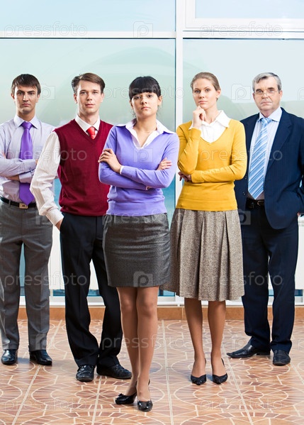Фото уверенных в себе менеджеров, стоящих на своих должностях с молодой леди перед ними