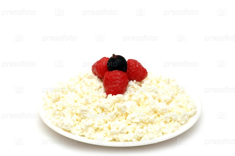 Творог с ягодами в тарелке, белый фон