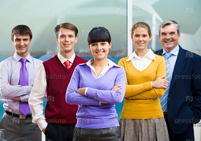 Портрет счастливой бизнес-леди, смотрящей в камеру на фоне своих коллег