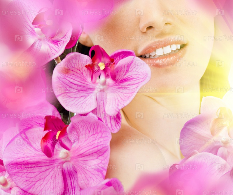 Красивое женское лицо на близком расстоянии, окруженное цветами