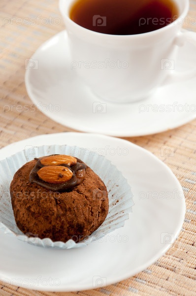 Трюфель с миндалем и чашка кофе
