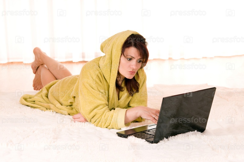 Портрет красивой девушки в халате с ноутбуком