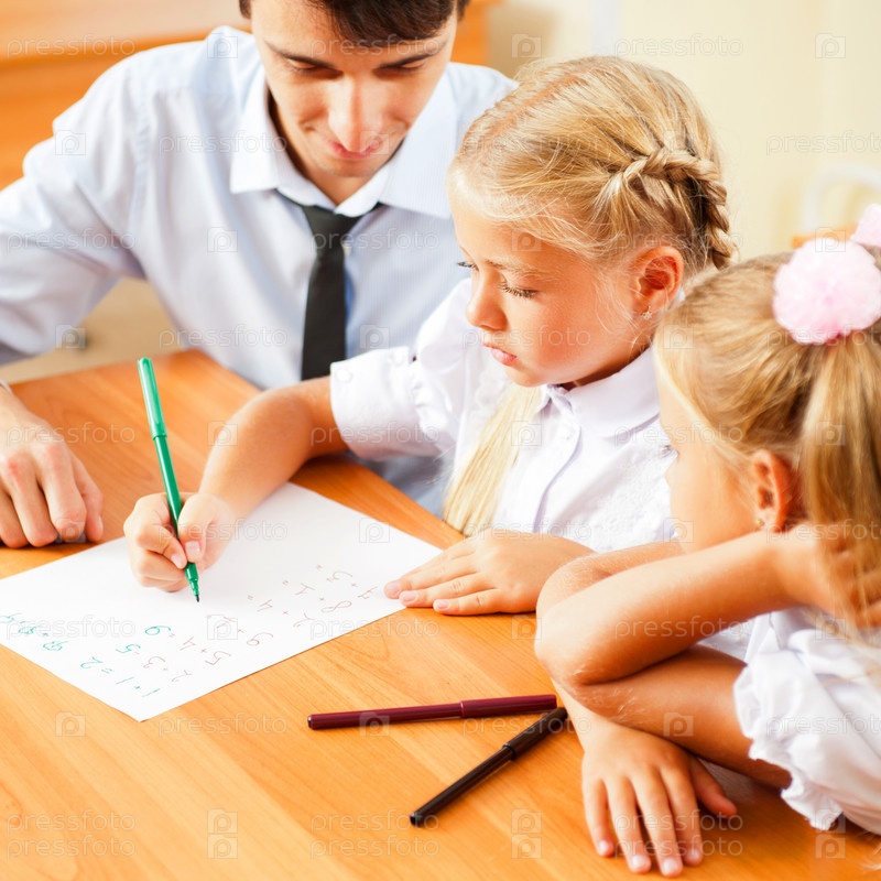 Молодой учитель занимается с детьми