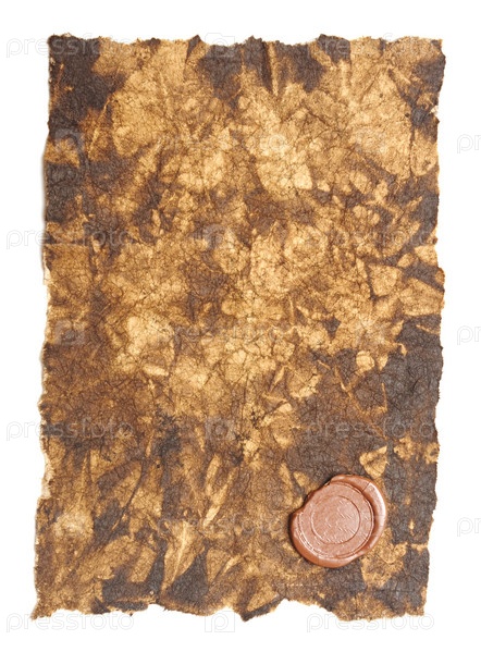 Жженая мятая бумага с сургучной печатью на белом фоне