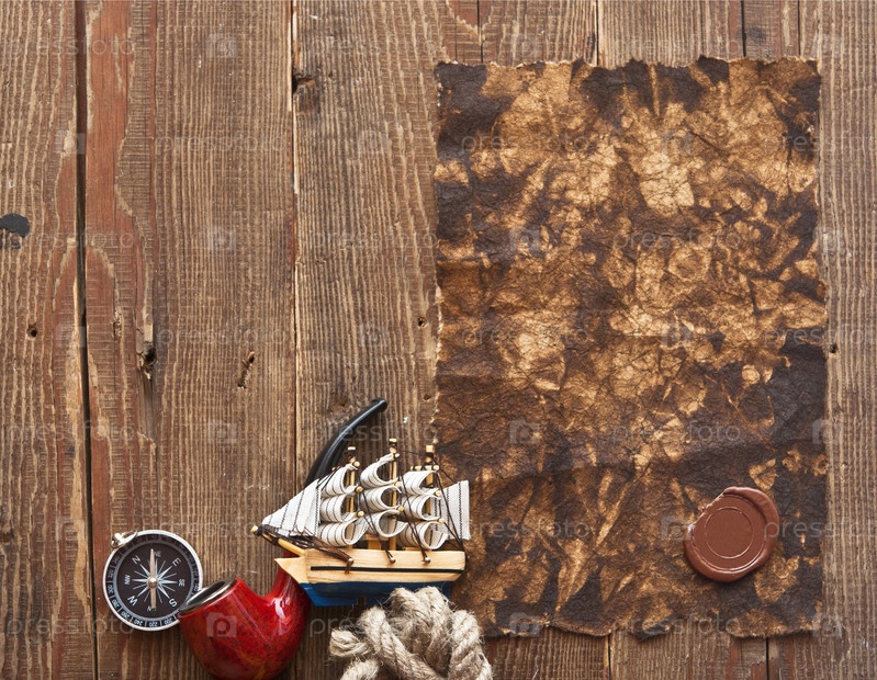 Жженая бумага с сургучной печатью, морская веревка, кораблик, курительная трубка и компас на деревянной стене
