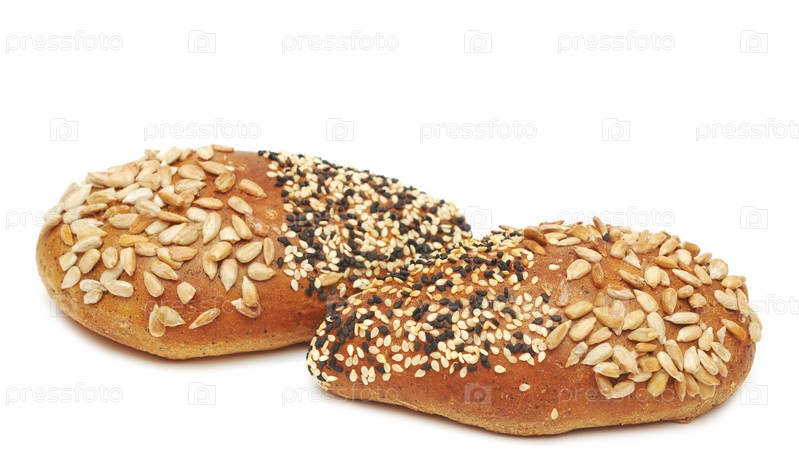 Две булочки с семечками и кунжутом на белом фоне