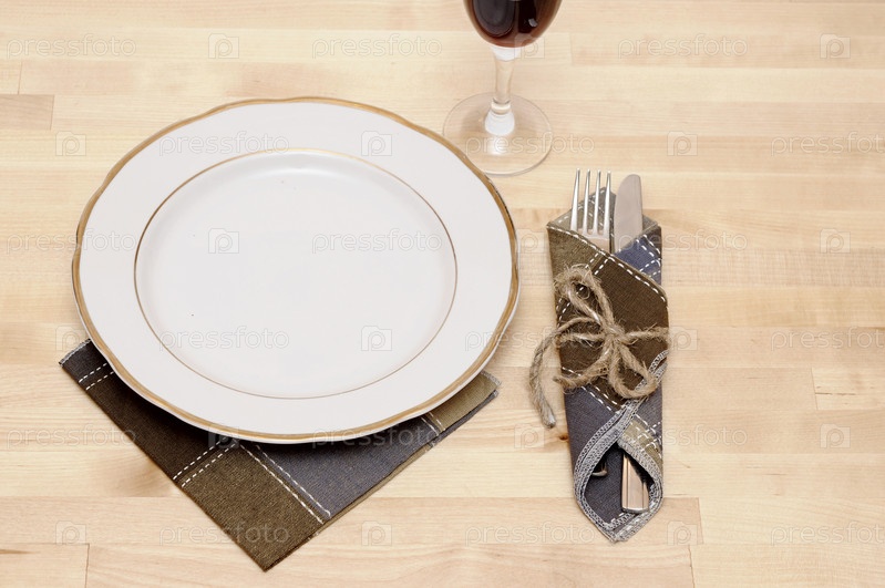 Салфетка, нож, вилка и тарелка на столе