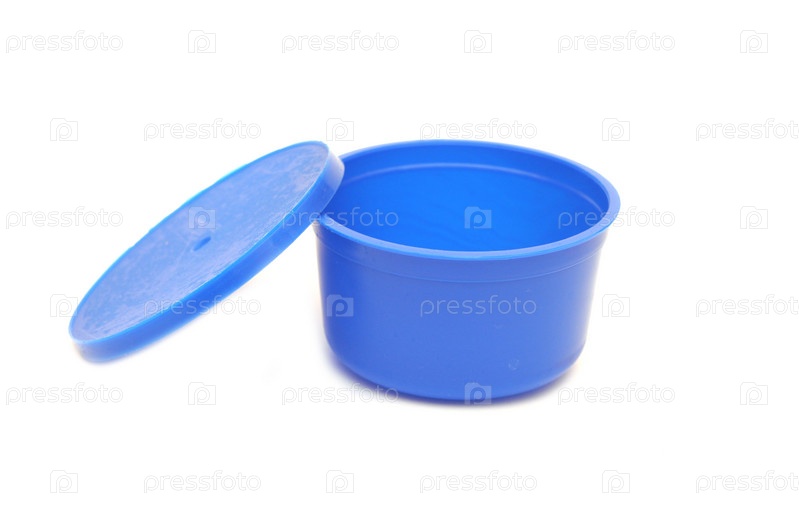 Синяя пластиковая банка с крышкой на белом фоне