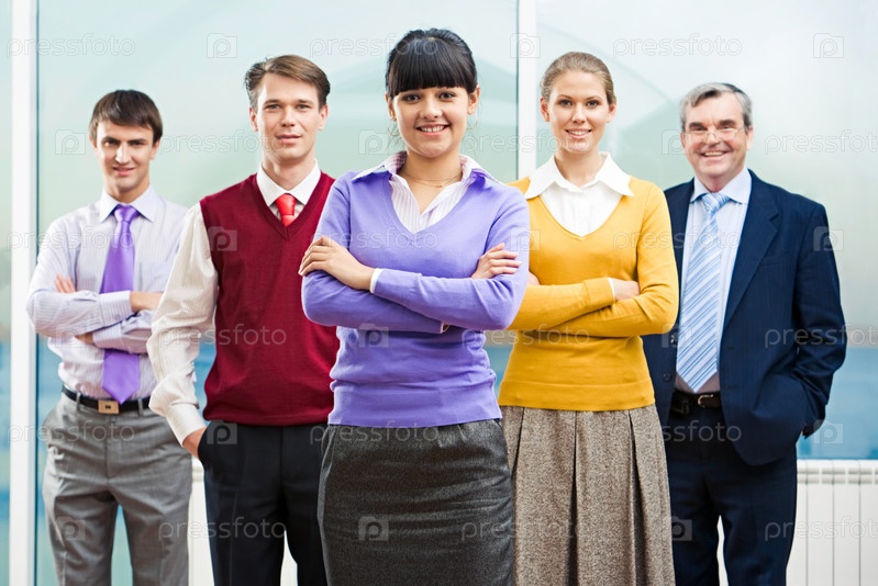 Портрет улыбающегося менеджера, глядящего в камеру на фоне успешных бизнесменов