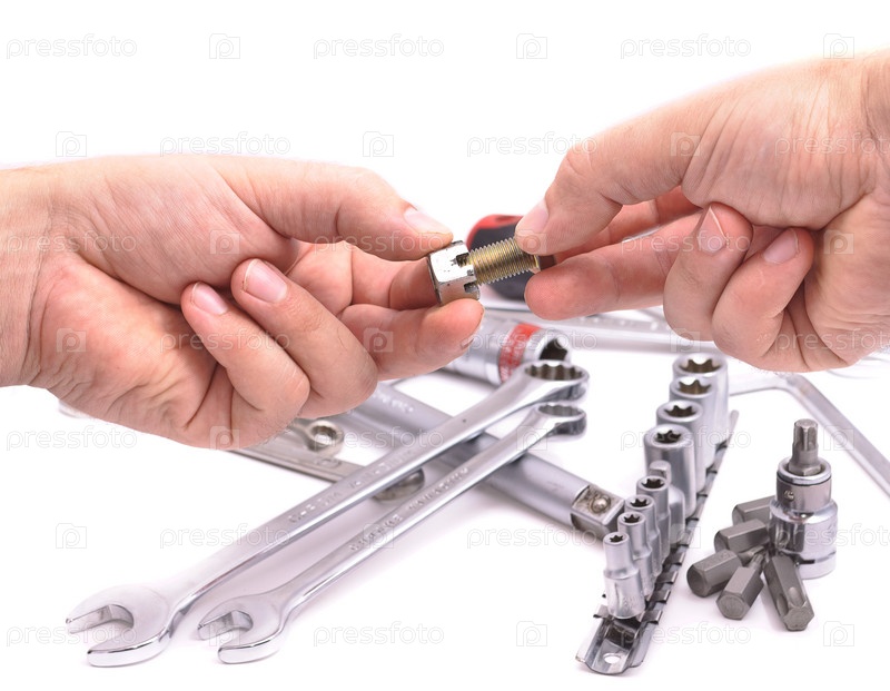 Мужские руки с гайкой, болтом и набором ключей на белом фоне