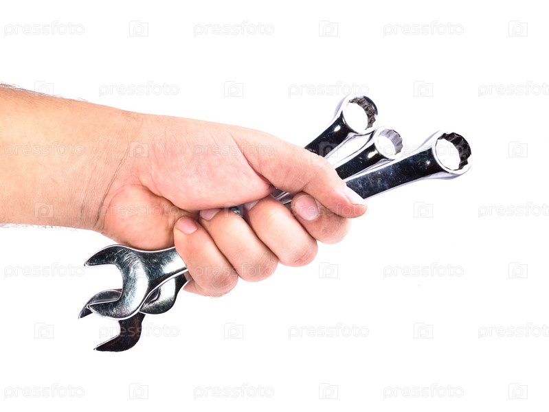 Мужская рука с гаечными ключами на белом фоне