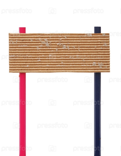 Пустая табличка из картона на двух разноцветных столбах, белый фон