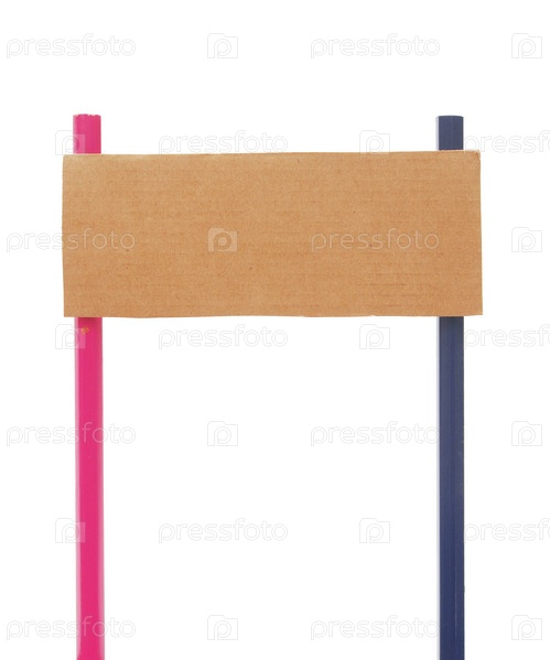 Пустая табличка из картона на двух разноцветных столбах, белый фон
