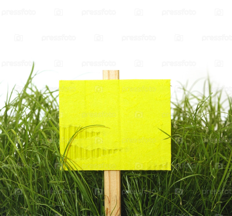 Пустая табличка из желтого картона на траве, белый фон