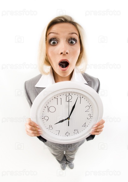 Рыбий глаз деловой женщины, открывающей рот от удовольствия показывая часы