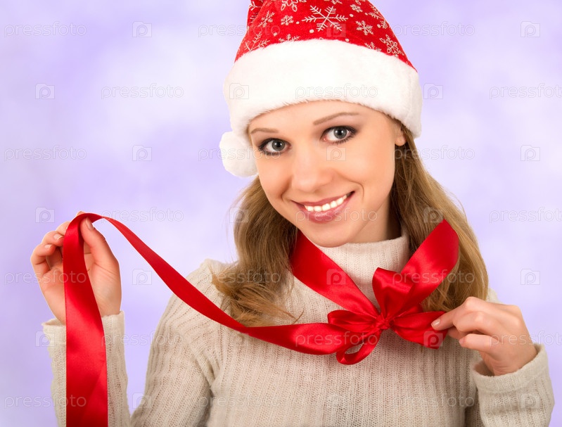 Девушка в новогоднем колпаке с красным бантом на шее