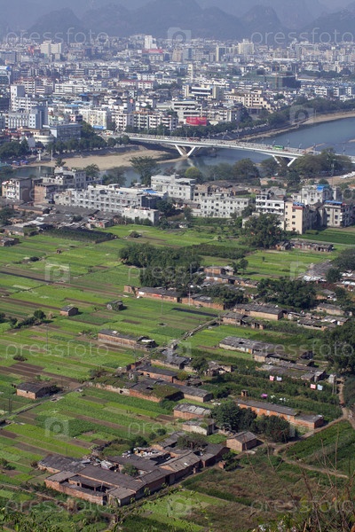 Деревня и возделанные поля на окраине города Гуйлинь. Китай