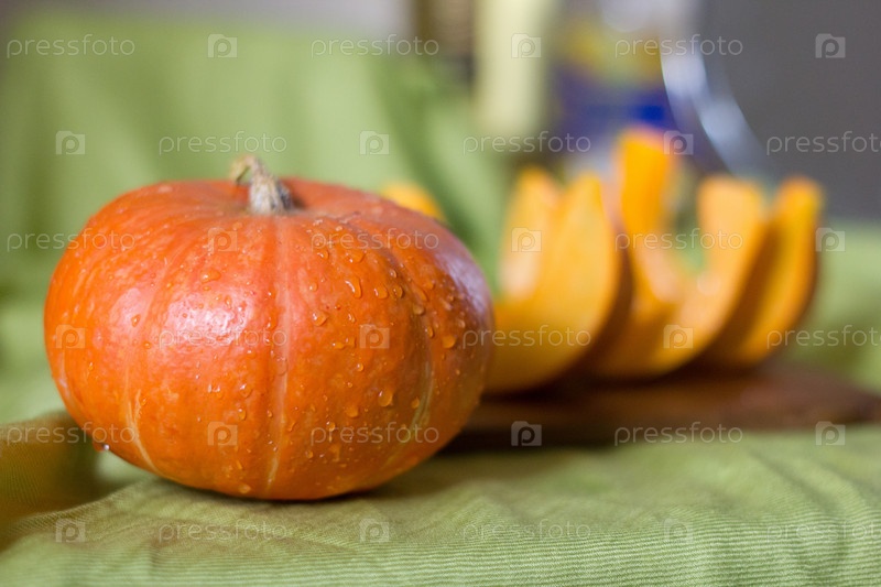 Тыква и дольки тыквы на фоне зеленой ткани