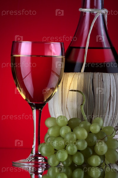 Бутылка вина, бокал и гроздь винограда на красном фоне