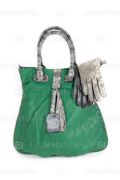 Зеленая женская сумка и перчатки на белом фоне