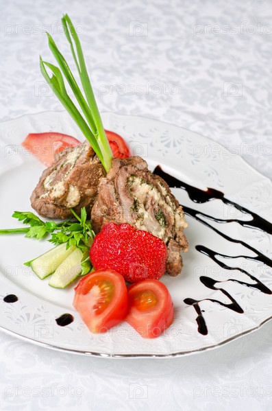 Свиной рулет с сыром, украшенный луком, огурцами и помидорами