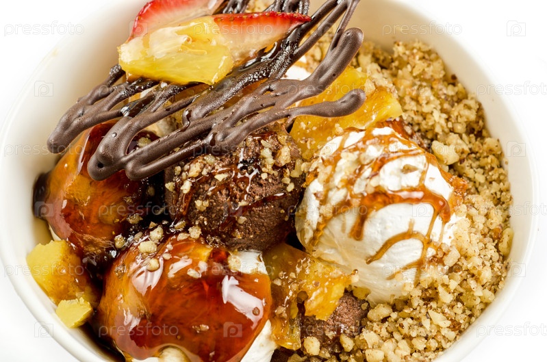 Мороженое с шоколадом, орехами и карамелью крупным планом