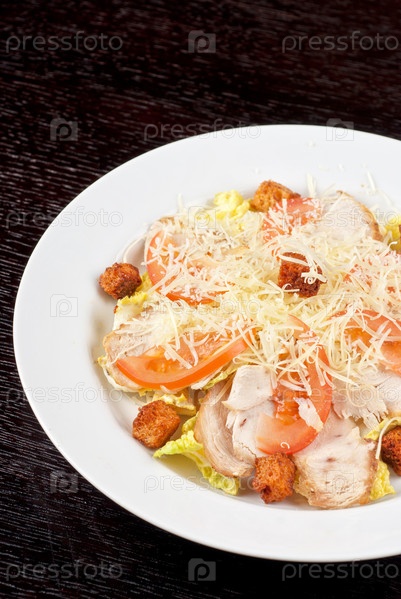 Салат "Цезарь" с курицей на черном фоне