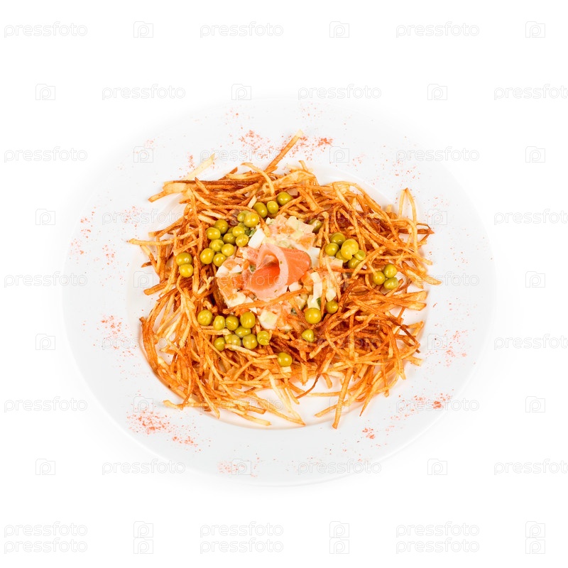 Салат с лососем и картофелем на белом фоне