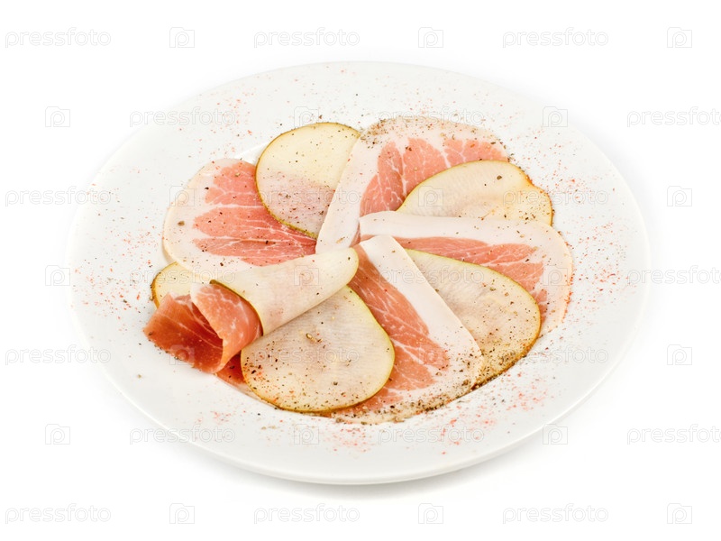 Ломтики бекона с ломтиками груши на белом