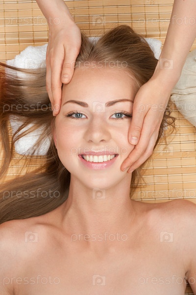 Красивой девушке, лежащей в спа-салоне, делают массаж лица