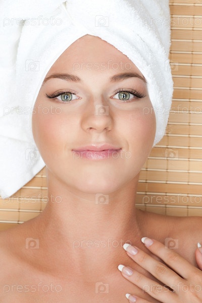 Красивая девушка с белым полотенцем на голове лежит в спа-салоне