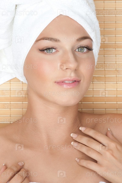 Красивая девушка с белым полотенцем на голове лежит в спа-салоне