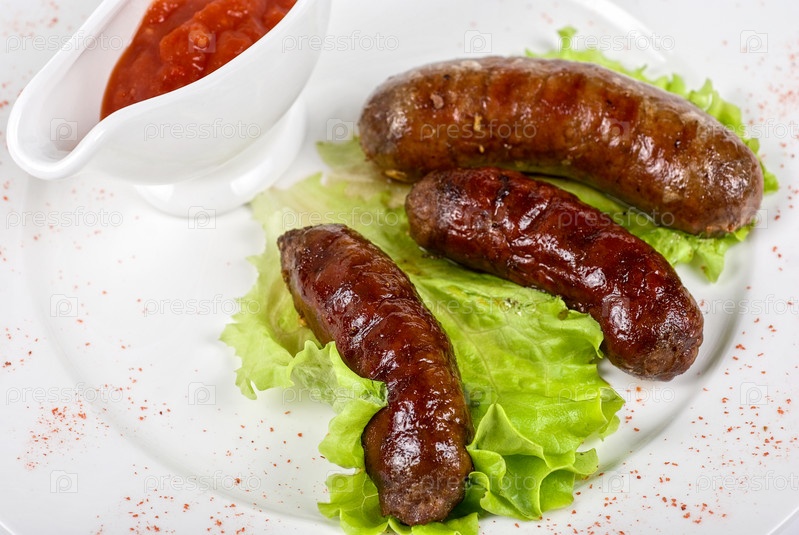 Жареные колбаски крупным планом с листьями салата и соусом