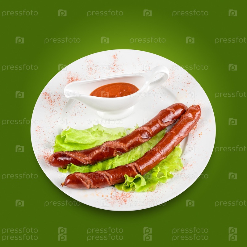 Жареные колбаски крупным планом с листьями салата и соусом, на зеленом фоне