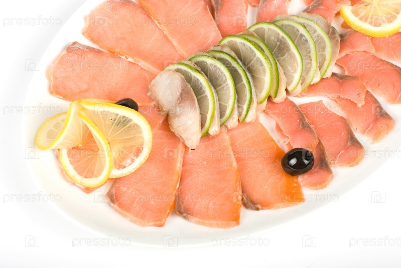 Ломтики кеты и скумбрии крупным планом с лаймом, лимоном и маслинами