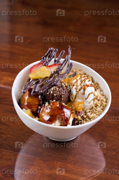 Десерт с мороженым, карамелью и орехами