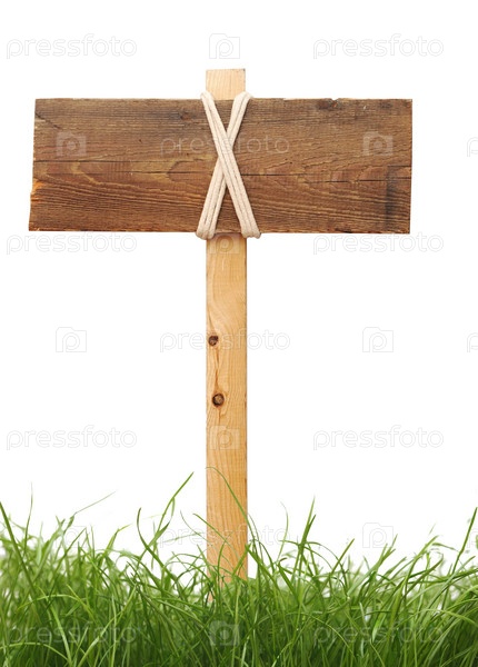 Деревянная табличка в траве на белом фоне